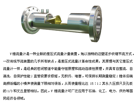 V錐流量計是一種全新的差壓式流量計量裝置,并以******的邊壁逐步收縮節流方式,一改傳統節流的幾乎所以缺點(diǎn),是差壓式流量計革命性成果,因此V錐流量計可廣泛用于石油,化工,電力,熱供等國民經(jīng)濟各領(lǐng)域